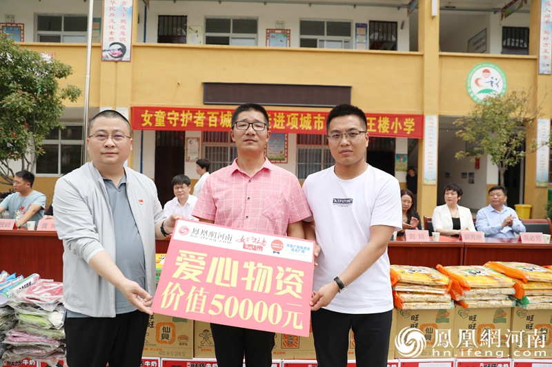 最后,周口市委网信办主任刘成华,周口市委网信办副主任朱国杰,项城市委常委、宣传部长刘娟等领导,以及凤凰网河南频道CEO李彬、FM106.6河南广播电视台教育广播教育工作室副主任任鹏欣和爱心企业旺旺集团、开拓者易货集团、红旗教育集团等企业代表向学生发放书包、体育器材、图书、旺旺大礼包等价值5万元的爱心物资。