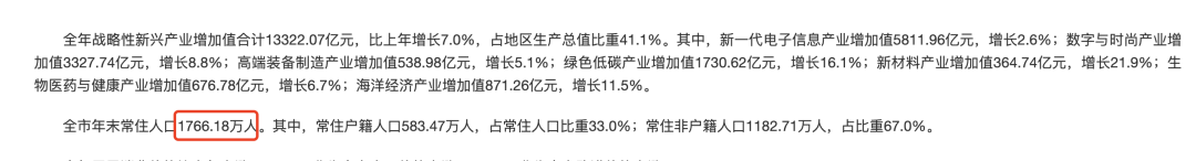 2022年,深圳常住人口为1766.18万人,这个数字比2021年的1768.16万人,减少了1.98万人