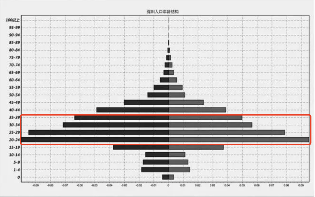 在深圳,20-30岁的年轻人口,总量达到417万,占常住人口的比例达到23%,也就是说,深圳每四个常住人口里,就有一个20-30岁的青壮年