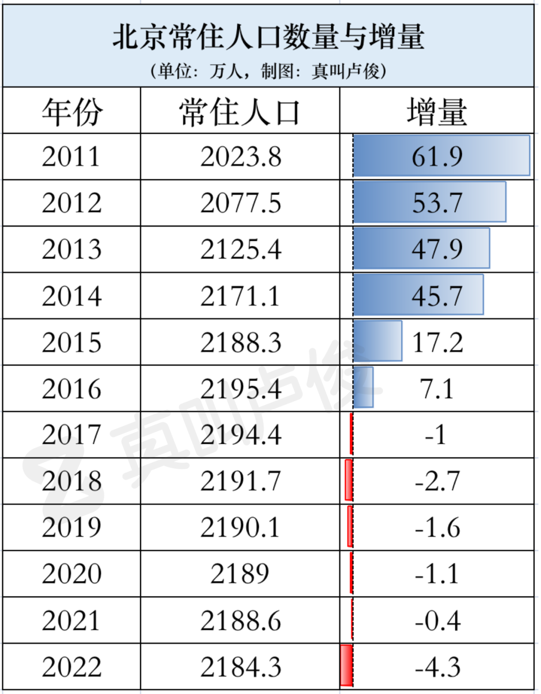从2015年北京人口增速开始放缓之后,从2017年开始,北京正式进入人口负增长时代,2022年也流失了4.3万人
