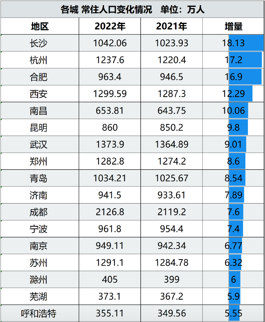 尤其以长沙的18万最为突出,不仅已经超过了2021年的人口增量17.85万人,反超杭州,成为去年人口吸引力最强的城市