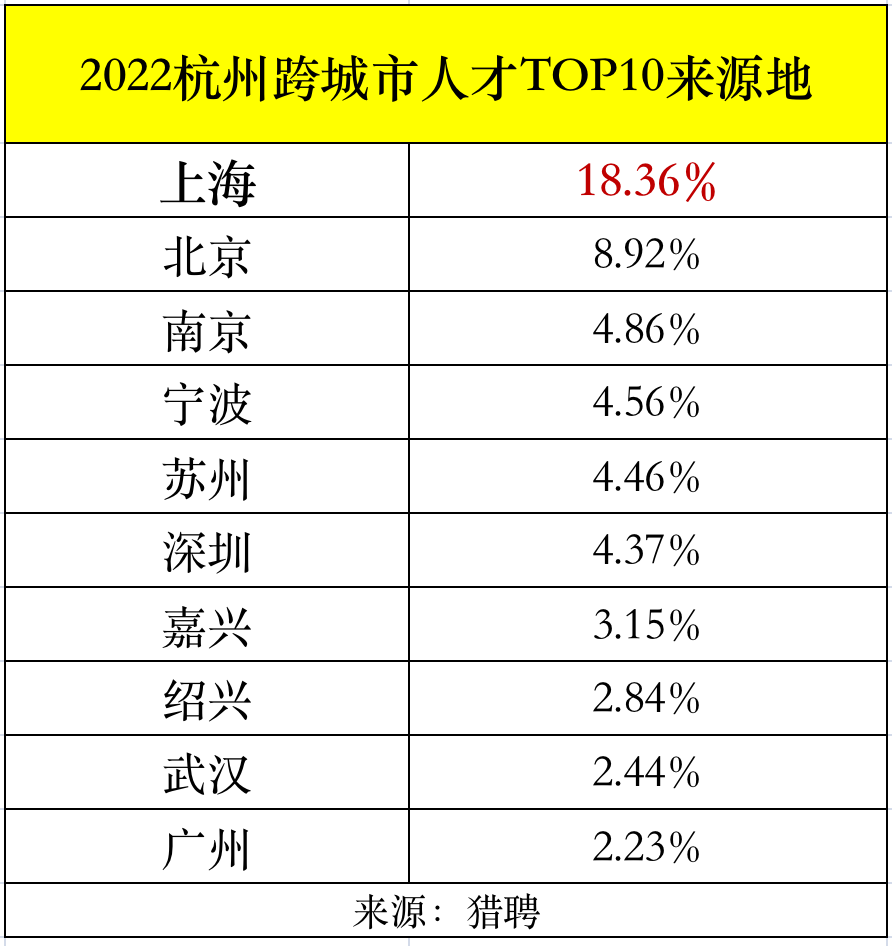 2022杭州跨城市人才,最多来源于上海,其次北京