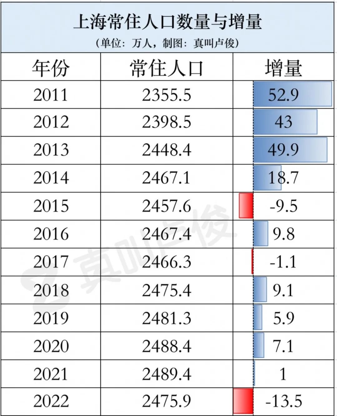 到了2022年,上海常住人口直接减少13.54万人,成为降幅最大的一年