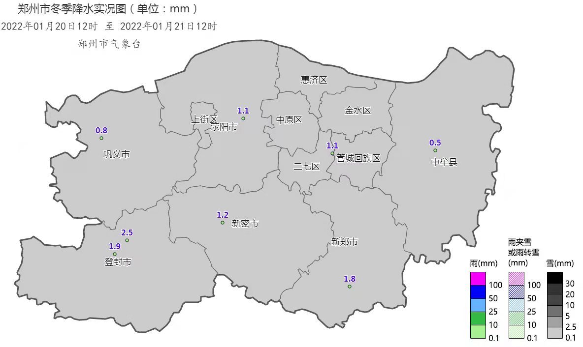 今天白天,郑州普降雪花。郑州市气象台统计,1月20日20时至21日12时,郑州市出现小雪,降雪量(毫米)方面,郑州1.1,登封1.9,新密1.2,新郑1.8,巩义0.8,荥阳1.1,中牟0.5,嵩山2.4。