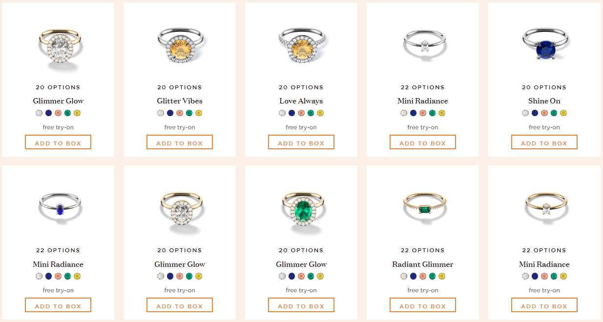在美国,除了 Gmeist 以外,还涌现出了更多的线上珠宝品牌,包括 Frank Darling、Rocksbox 和 AUrate 等。这些品牌都提供了线上购买平台,并为消费者提供私人定制服务,都是珠宝首饰行业在“try-at-home”,即让客户在家里试戴珠宝的尝试者。