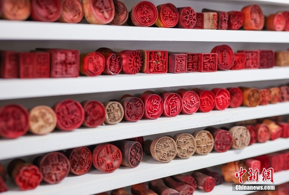 11月26日,“摄影记者走进老字号”活动探访了有着百余年历史的糕点品牌——北京稻香村。北京稻香村品牌创始于1895年(清光绪二十一年),2006年,北京稻香村被商务部认定为“中华老字号”。如今,北京稻香村已发展成为一家现代化的食品公司,主要经营糕点、熟食、速冻食品等16大类600多个产品,被消费者亲切的称为“京城百姓大食堂”。图为北京稻香村大师工作室内,墙上摆放着大量糕点印章。中新社记者 贾天勇 摄