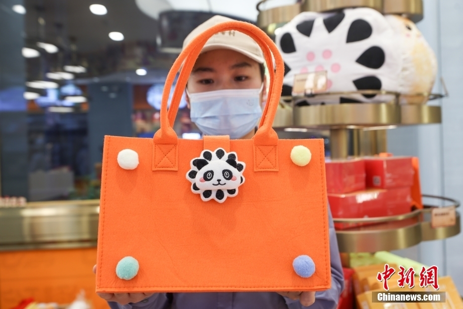 11月26日,“摄影记者走进老字号”活动探访了有着百余年历史的糕点品牌——北京稻香村。北京稻香村品牌创始于1895年(清光绪二十一年),2006年,北京稻香村被商务部认定为“中华老字号”。如今,北京稻香村已发展成为一家现代化的食品公司,主要经营糕点、熟食、速冻食品等16大类600多个产品,被消费者亲切的称为“京城百姓大食堂”。图为位于北京市东城区隆福寺的北京稻香村新型门店——零号寻宝馆内,店员展示一款文创手提袋。中新社记者 贾天勇 摄
