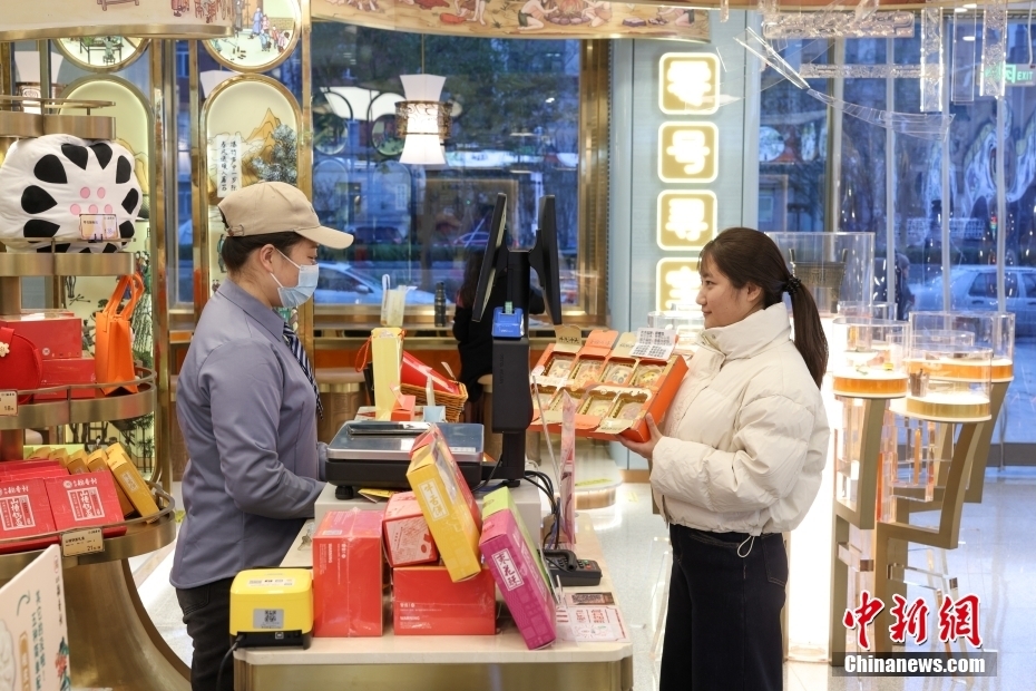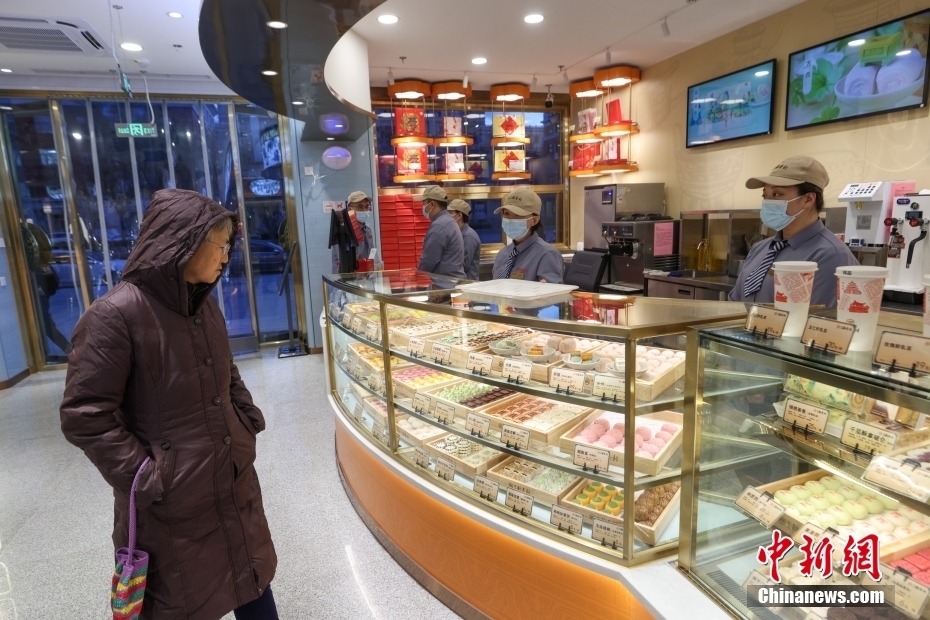 11月26日,“摄影记者走进老字号”活动探访了有着百余年历史的糕点品牌——北京稻香村。北京稻香村品牌创始于1895年(清光绪二十一年),2006年,北京稻香村被商务部认定为“中华老字号”。如今,北京稻香村已发展成为一家现代化的食品公司,主要经营糕点、熟食、速冻食品等16大类600多个产品,被消费者亲切的称为“京城百姓大食堂”。图为位于北京市东城区隆福寺的北京稻香村新型门店——零号寻宝馆内,市民在选购糕点。中新社记者 贾天勇 摄