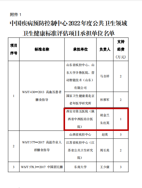 近日,由西安市第五医院业务副院长朱红英、心血管病医院心血管一病区主任胡金兰申报的《WS/T 430—2013高血压患者膳食指导》荣获中国疾控中心2022年度公共卫生领域卫生健康标准化研究项目立项。该项标准将由山东省疾控中心等、国家卫健委北京老年医学研究所及西安市第五医院三家承担单位共同研究完成。