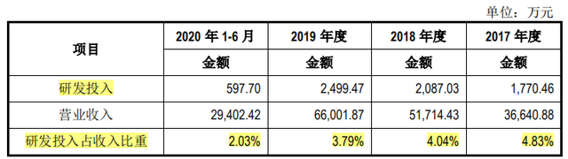 亨迪药业称视研发创新为核心驱动力,围绕非甾体抗炎类、心血管类、抗肿瘤类等重点疾病领域开展原料药及制剂的研发和产业化。招股书资料显示2017年-2019 年及2020年1-6月公司的研发费用分别是1,770.46 万元、2,087.03万元、2,499.47万元和 597.70万元,研发投入占收入的比例分别为4.83%、4.04%、3.79%和2.03%,占比下滑,且对比同行可比公司均值5.39%、6.11%、6.34%和5.77%,公司的研发费用率低于同行业可比公司的平均值。