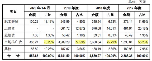 权衡财经注意到2017年-2019年及2020年1-6月亨迪药业的销售费用分别为2388.35万元、4830.27万元、5141.5万元和552.65万元,其中公司市场推广费分别为1,390.81万元、3,660.84万元、3,989.29万元和388.27万元,2018年和2019年较2017年度大幅增加。