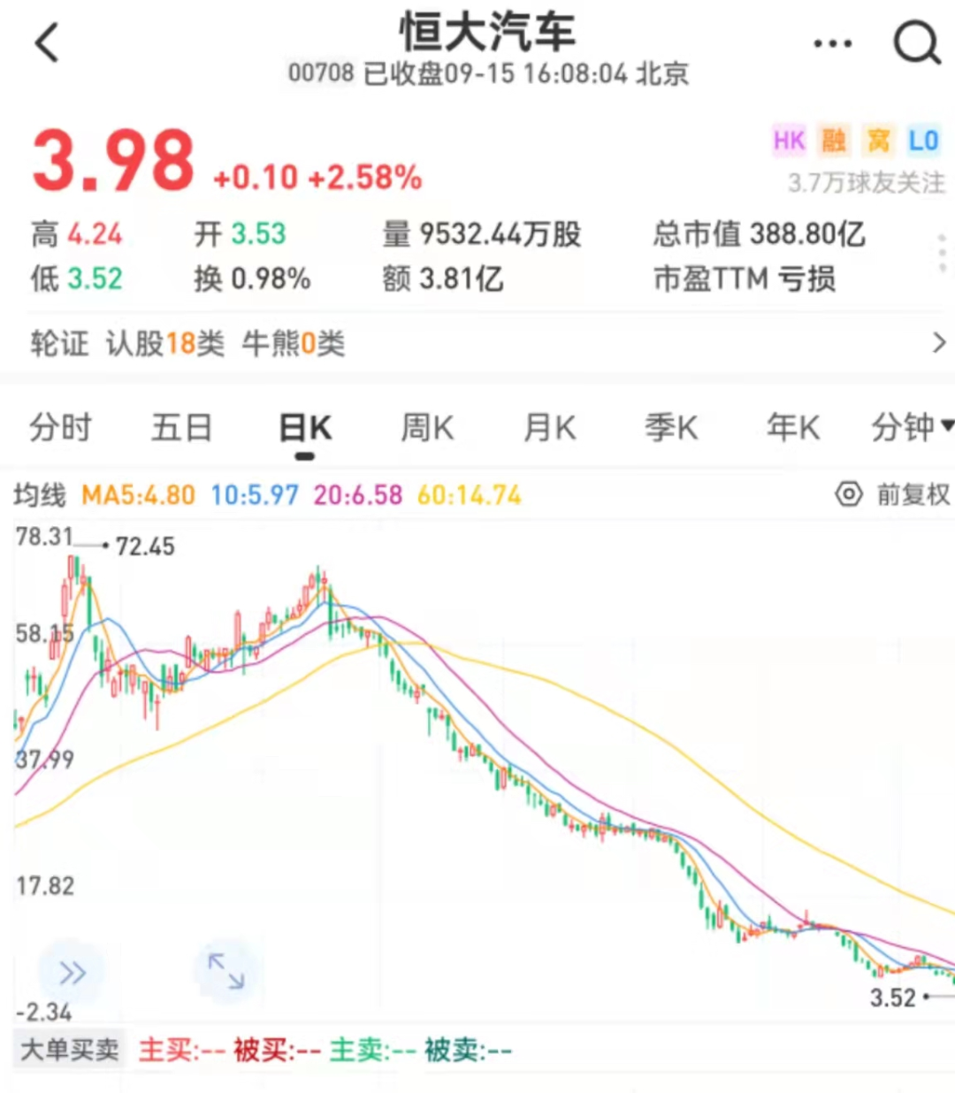 曾经烈火烹油的恒大汽车,股价则从最高的72.45港元,像坐过山车一样的,一路跌到了3.98港元,打了0.5折,一张大饼剩下不到一点渣渣!