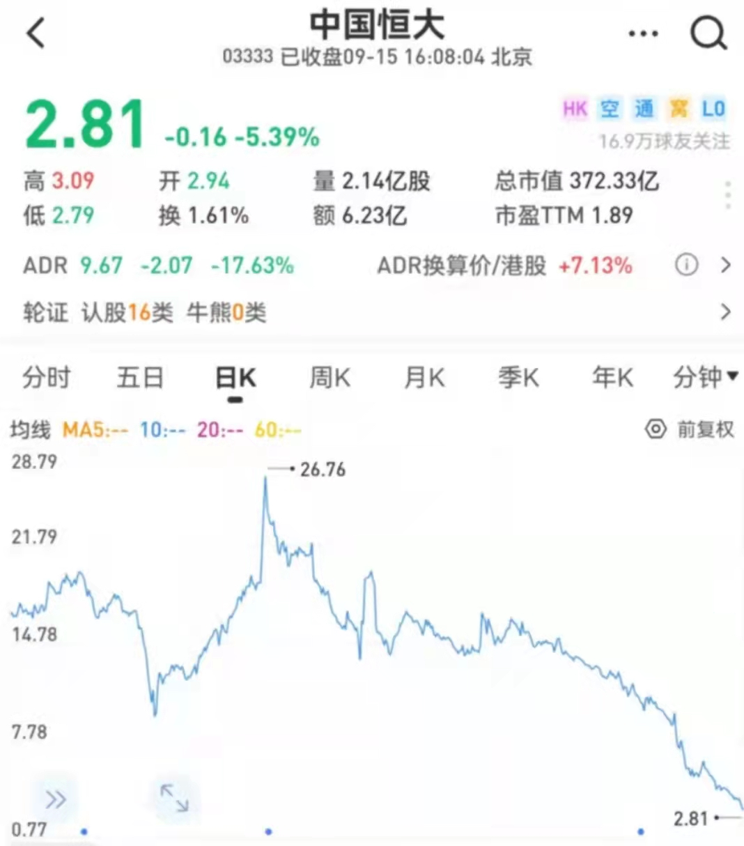 截止到15日收盘,中国恒大市值372亿港币,股价从去年年8月份的26块多港元,一路跌到了现在的2.81港元,缩水了将近九成。