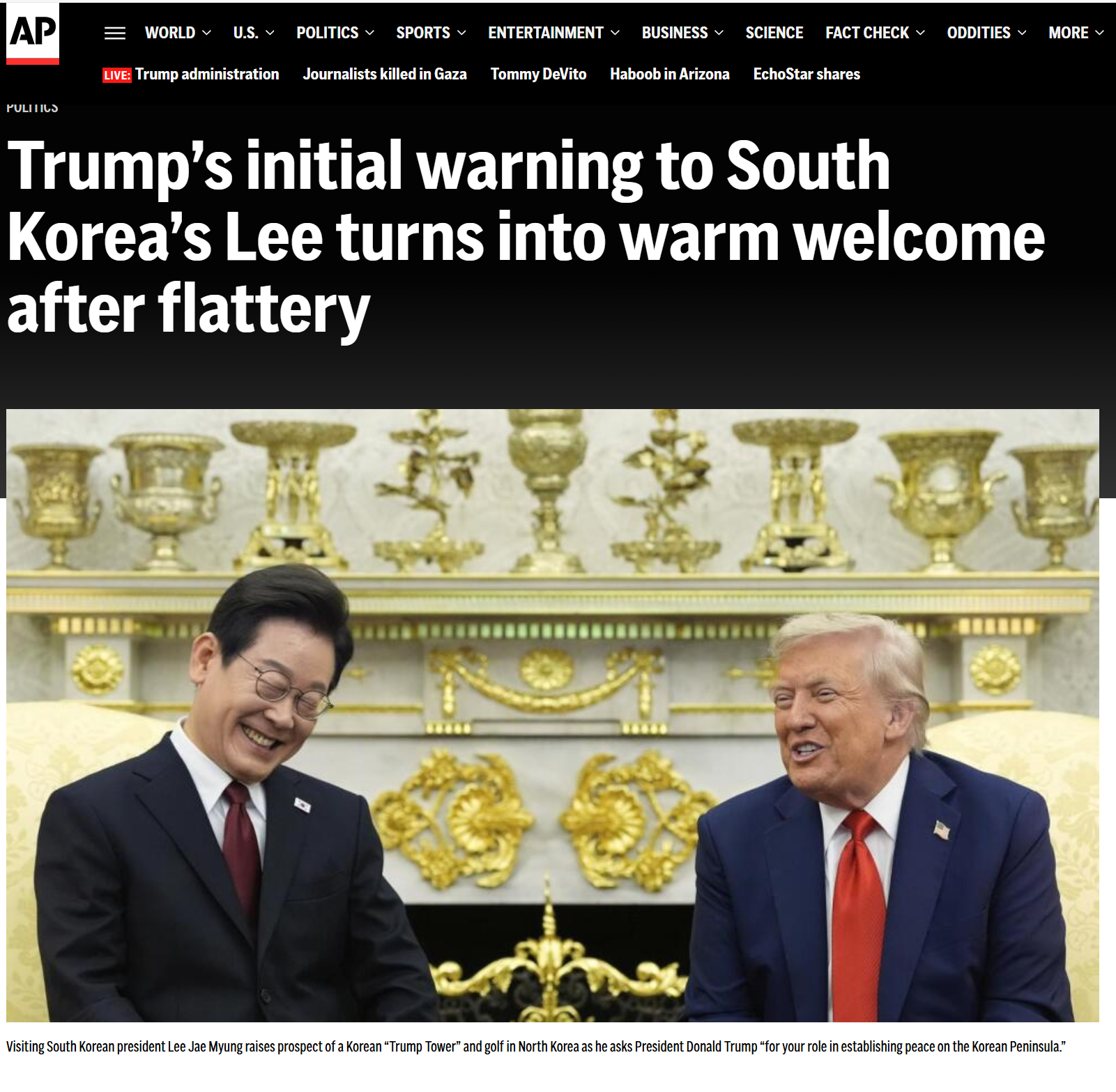 好在见面后,李在明先是恭维特朗普对白宫椭圆办公室的重新装修非常“美丽”,赞扬了特朗普在半岛和平方面的持续努力和重要角色,还说应该在朝鲜修建一座特朗普塔。这也换来了特朗普的商业回吹:“我们彼此认识并且相处得很好,很荣幸能和你在一起,祝贺你当选。那是一件大事,我们100%支持你。”这也被韩国媒体解读为特朗普支持李在明的当选和政策,使韩国右翼一直鼓吹的“选举舞弊”大受打击,令韩国国内极右翼势力大为失望,而这可能也是李在明访美的重要成果之一。