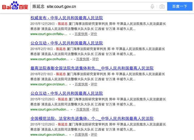4. 【场景描述】了解一位法官的背景,不仅可以检索其裁判文书,还可以site一下最高法院网站,了解其在法院系统内的其他信息。比如,在专业研究中经常看到一个叫陈延忠的法官,在微信公众号上刊载过不少涉外法律问题文章,site最高院网站检索了一下,发现陈法官作为专业精英还屡受表彰。