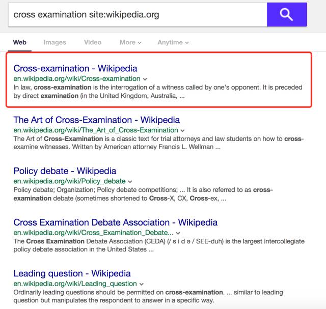 4. 【场景描述】如果你想要了解某个术语的基本含义,还可以site维基百科全书,比如想了解交叉盘问的基本知识点,可以site如下。