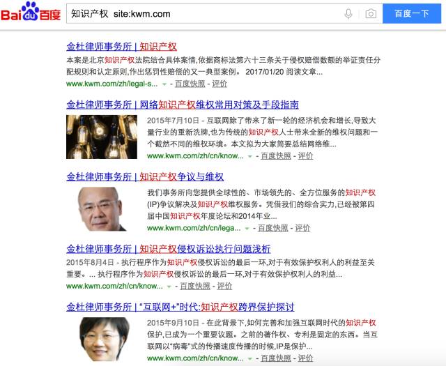3. 【场景描述】比如,要理解某个律所,在某个专业领域的相关文章,可以site一下。比如金杜律师事务所的知识产权情况。