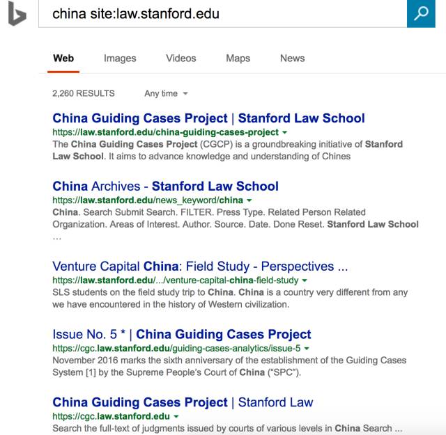 2. 【场景描述】想看一下,国外知名法学院,涉及中国的内容有哪些,比如斯坦福大学法学院关于中国方面的内容。可以用bing搜索引擎site一下。