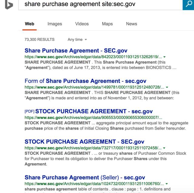 1. 【场景描述】要找英文的股份购买协议,也可以在美国的证监会网站site一下。国内谷歌因为上不了,就用bing替代一下。