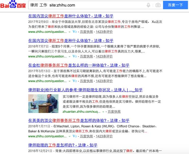 1. 【场景描述】法科毕业生,要找律所工作,想了解下相关情况,可以site知乎进行检索,里面的回答,很多都是知识控。不过现在知乎也可以用搜狗检索。