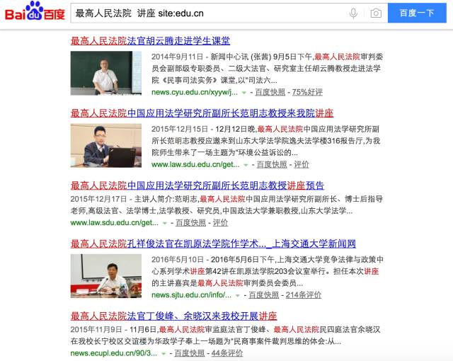 1. 【场景描述】最高人民法院的法官们,很多理论扎实具有博士学位,又兼有丰富审判经验,想聆听他们的课程似乎不易。但大法官们也经常走进高校进行讲座,可以site各大学网站,就能够了解相关主题。大部分高校网址都带有“edu.cn”,不妨以此试试。