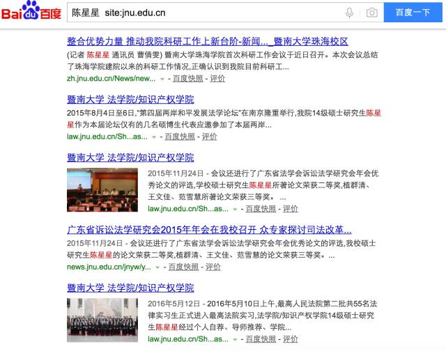 3. 【场景描述】听说德恒特哥前段新招聘个助理,暨南大学毕业的,于是site检索了一下,发现陈同学经常参加各种学术活动,还获得过论文奖项以及具有最高院实习的经历,这个小鲜肉有点猛,是个可造之材。