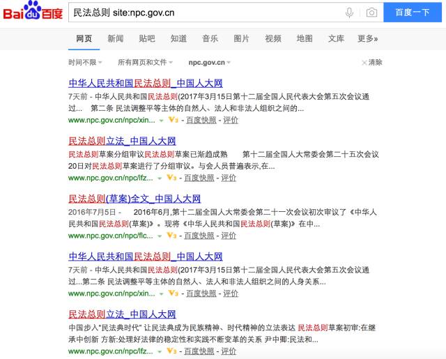 2. 【场景描述】一部法律(狭义),想验证一下,是否有权威出处。比如,前一段,微信上出现了“假”的民法总则,我们本着法律人的严谨,在转发之前可以site中国人大网验证真实性。