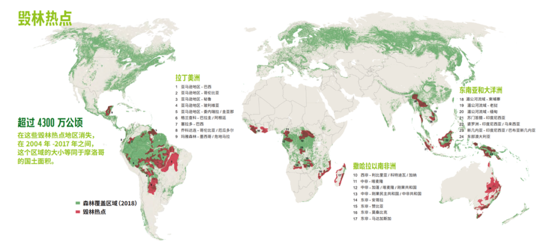 我们正走在林地退化、气候变化和自然损失等危机相互交织的道路上。根据WWF《地球生命力报告2022》显示,过去50年以来,全球范围内观测到的野生动物种群数量平均下降了69%[1]。WWF《全球森林生命力展望——保护现状与对策》报告中所确定的全球范围内24个“毁林热点”——即毁林热点集中且显著的地区以及拥有大片受威胁森林的地区,仅在2004年至2017年之间,就有4,300万公顷的森林在这些地区消失,面积大约相当于摩洛哥的国土面积[2]。虽然全球各地均已采取各种手段来阻止毁林和林地退化,并取得了一定进展,但森林毁坏的情况仍然在以惊人的速度恶化。