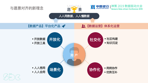 中原银行已成为全国第一家全面数字化转型银行,并致力于通过数据促进传统银行业态的转变升级,为此,我们提出“人人用数据、人人懂数据”的愿景,平台化产品和体系化运营是实现愿景的两板斧,如下图: