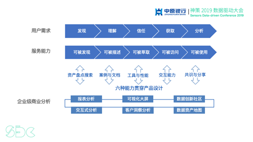 就服务本身来说,主要包含资产盘点搜索、案例与文档、工具与性能、交付能力、共识与分享。此外,在功能强大的基础上也需加强使用体验,我们做了企业级商业分析中贯穿产品设计的六种能力赋能:报表分析、可视化大屏、数据创新社区、交互式分析、客户洞察分析、数据资产地图,如下图: