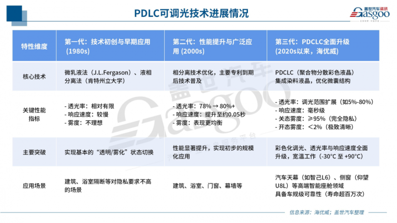 当下汽车调光玻璃市场,第二代 PDLC与EC两大技术路线分庭抗礼。前者虽实现快速变色,但在隔热、雾度控制与隐私保护上存在明显短板;后者虽在部分性能上略有提升,却受制于较高的成本与较慢的响应速度。而海优威所推出的第三代调光技术PDCLC,正在从多个维度改变游戏规则。