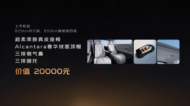 对于频繁往返沪杭、广深等地的商务人士来说,670km旗舰版四驱是不错的选择。豪华Nappa真皮和后排头枕屏,二排座椅带腿托、SPA按摩及一键躺倒功能,带遮阳帘的2.18㎡超大观景隔热天幕,商务接待面子十足。长途差旅或长途自驾爱好者,825km非凡版的超长续航是刚需。宁德时代140kWh麒麟电池,从杭州到北京仅需1次补能;CDC减震器+前后四空簧,大幅提升长途出行舒适性。这两个版型还限时加赠超柔苯胺真皮座椅、Alcantara、三排腿托、三排侧气囊等总价值20,000元的权益,进一步提升豪华舒适体验。