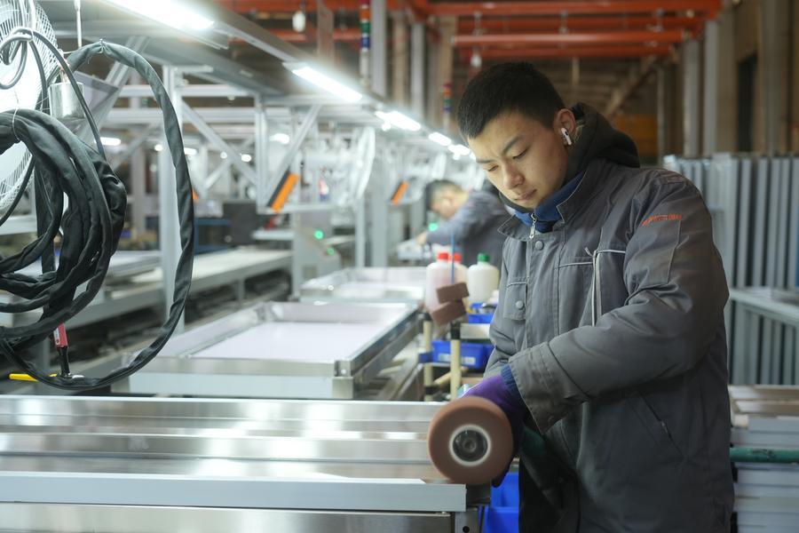 在山东省滨州市博兴县兴福镇一家厨具企业生产车间,工作人员在打磨厨具板材(2月7日摄)。新华社记者 高天 摄