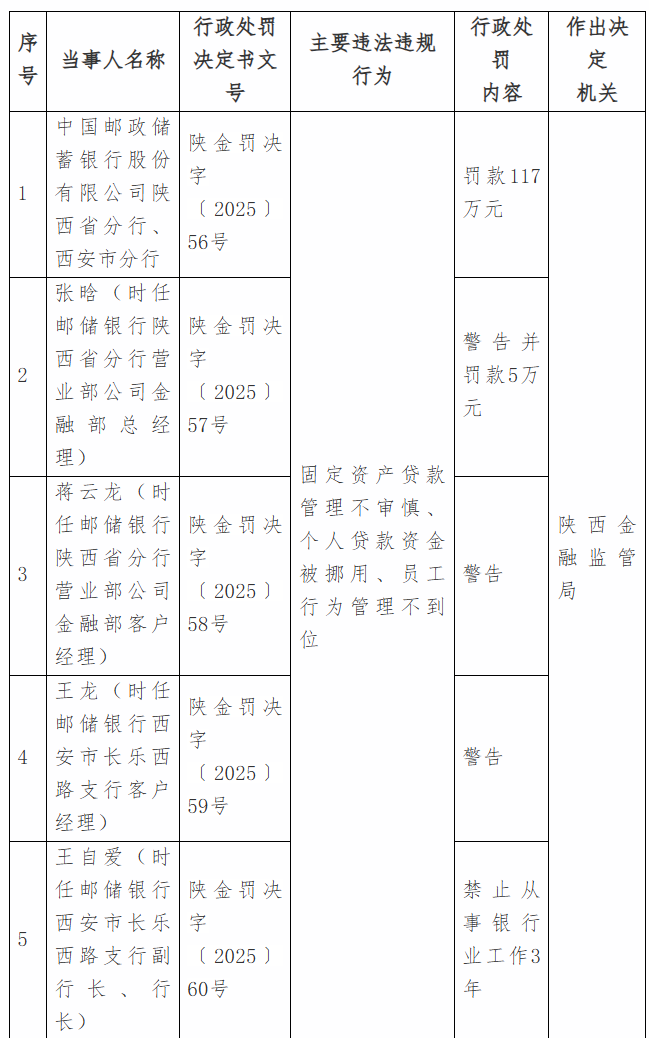 原标题:国家金融监督管理总局陕西监管局行政处罚信息公示表 陕金罚决字〔2025〕56、57、58、59、60号