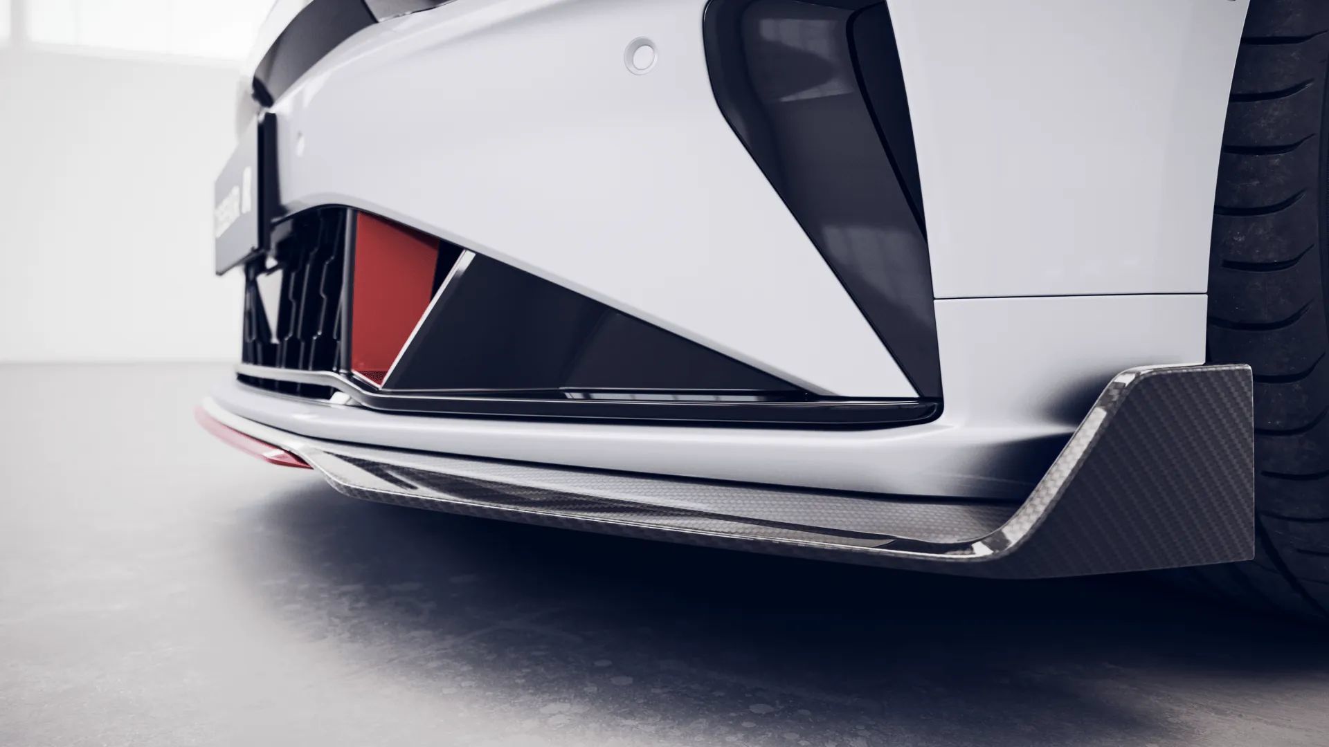 外观方面,极氪001 FR依旧采用了最新的家族式设计语言,并配备专属性能组件。前脸部分,封闭式格栅搭配两侧标志性的分体式前灯组极具辨识度。另外,该车在细节部位加入红色元素进行点缀,并配备碳纤维前唇组件,结合车头两侧亮黑色导风口设计战斗气息十足。
