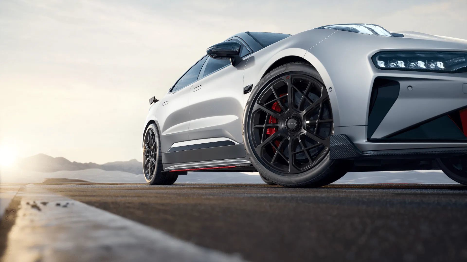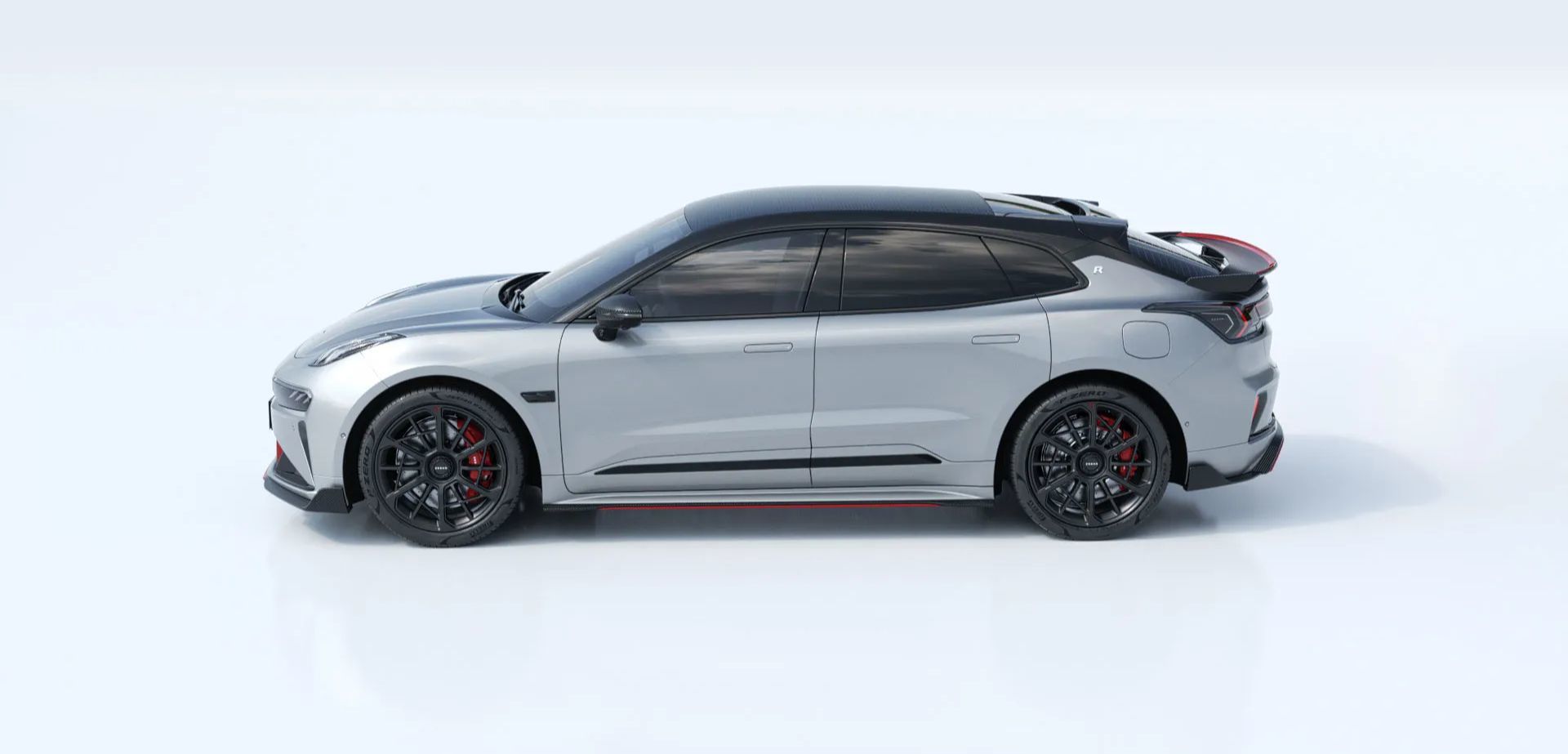 车身侧面,极氪001 FR配备碳纤维车顶及侧裙空气分离器,结合隐藏式车门把手在增强视觉冲击力的同时也能提升车辆空气动力学性能。值得一提的是,该车配备22英寸锻造轮圈及AP Racing前10后4活塞制动卡钳和Brembo碳陶制动盘和具有12档压缩/16档回弹阻尼可调的KW高性能绞牙避震器。