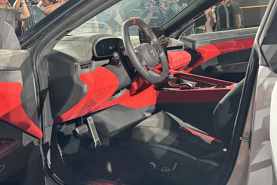 极氪001 FR内部采用红黑双拼配色风格,并在中控台、仪表板和座椅等区域使用大量Alcantara翻毛皮材质进行包覆,搭配一体式运动座椅驾驶氛围十足。与此同时,该车还配备带有回正标识与两个车辆性能模式选择旋钮的平底多功能方向盘,并内置高通8295智能座舱计算平台。
