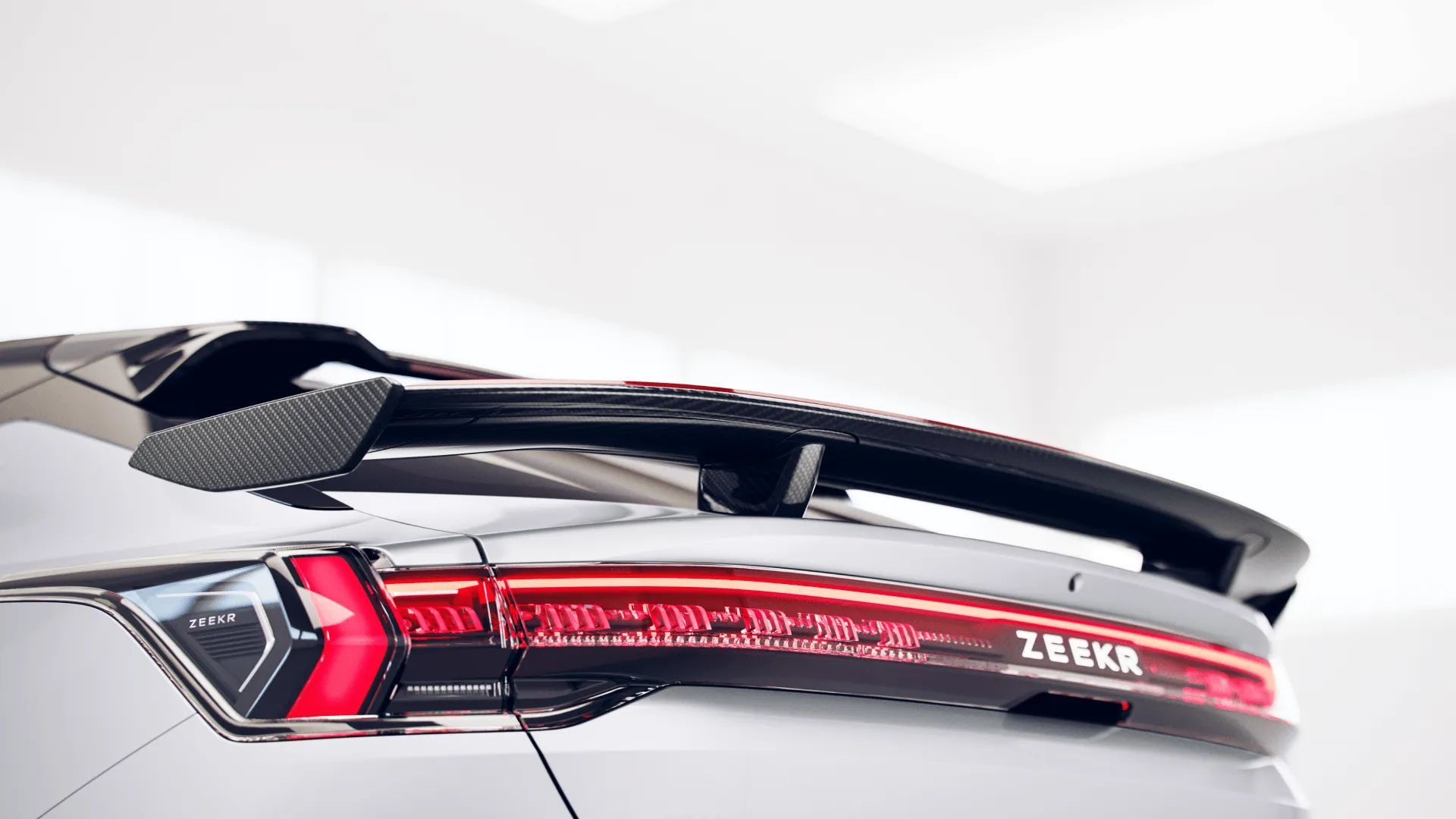 车尾部分,造型修长锐利的贯穿式LED尾灯组中央带有“ZEEKR”字样标识,点亮后极具辨识度。与此同时,极氪001 FR还在车尾配备固定式碳纤维风刃滑翔运动尾翼,搭配带有红色元素进行点缀并且造型夸张的碳纤维车尾气动扩散器组件,进一步车辆操控及空气动力学表现。