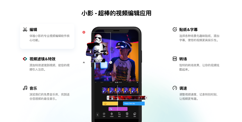 小影App(VivaVideo)主要面向剪辑小白,提供基础剪辑功能,例如添加背景和字幕、多种视频比例、语音转文字等。