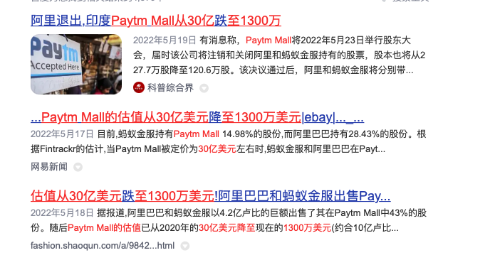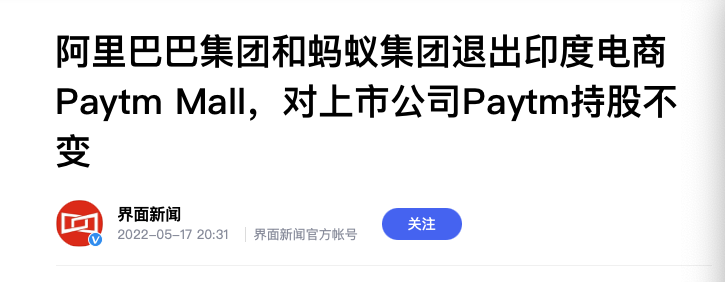 22 年的 5 月,更是爆出阿里和蚂蚁金服被曝退出 Paytm Mall ,也就是正在和亚马逊、沃尔玛进行电商大战的印度第三大电商平台。
