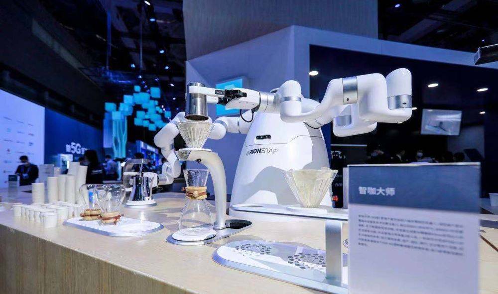 而一直忙碌做手冲的“智咖大师”,是猎户星空旗下的六轴双臂制饮机器人。