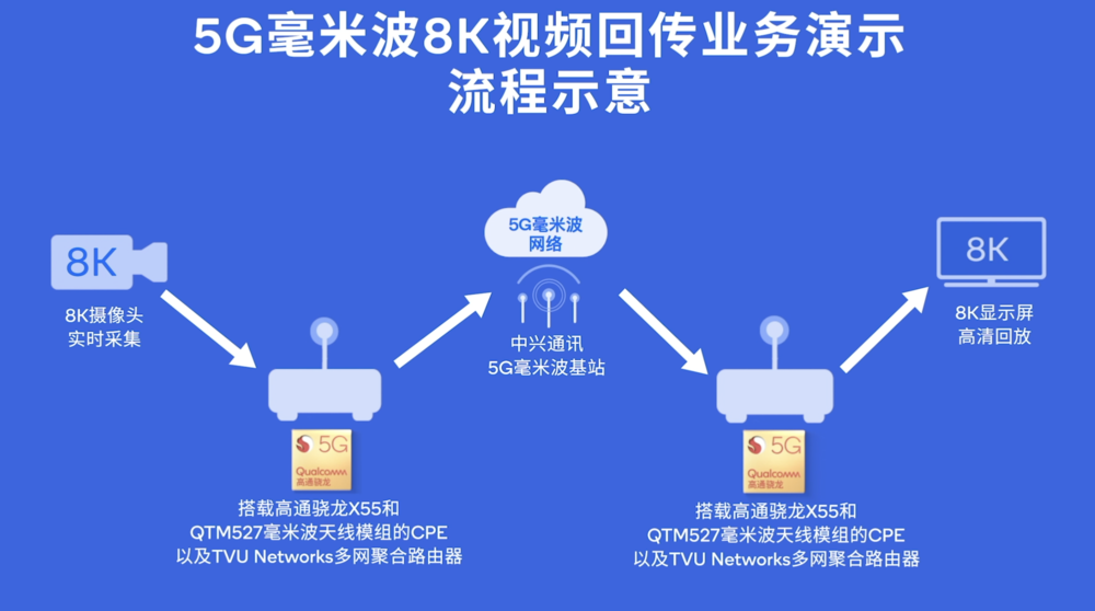 在音乐馆隔壁,5G毫米波+8K视频直播的展区让参会者眼前一亮。高通联合其他合作伙伴,首次在实验室环境下成功演示了基于毫米波上行DSUUU 帧结构的8K视频业务回传。在活动现场,我们也有幸看到了实验室的测试视频,借助于搭载高通骁龙™ X55 5G调制解调器及射频系统和高通QTM527毫米波天线模组等核心技术的CPE,TVU Networks的5G多网聚合路由器利用毫米波的大上行DSUUU帧结构实现了8K视频的实时回传。该技术既可以应用在大型赛事、活动现场的媒体直播,也可以扩展到实时高清视频监控回传的工业领域,具有极其重要的应用价值。