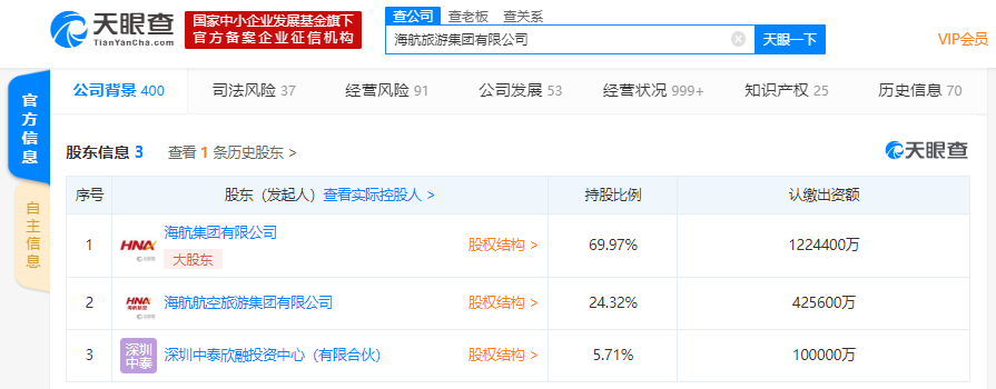 天眼查股东信息显示,公司第一大股东为海航集团的运营主体海航集团有限公司,持股比例为69.97%,公司第二大股东为海航航空旅游集团有限公司,持股比例为24.32%。