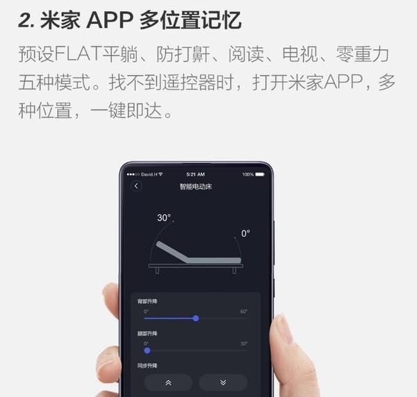 电动床配备了高装备的双马达,可在后腿上操作,并且可以独立提升。背部0-60°可调,腿部0-30°可调,无档位限制,任何角度均可随意调节。