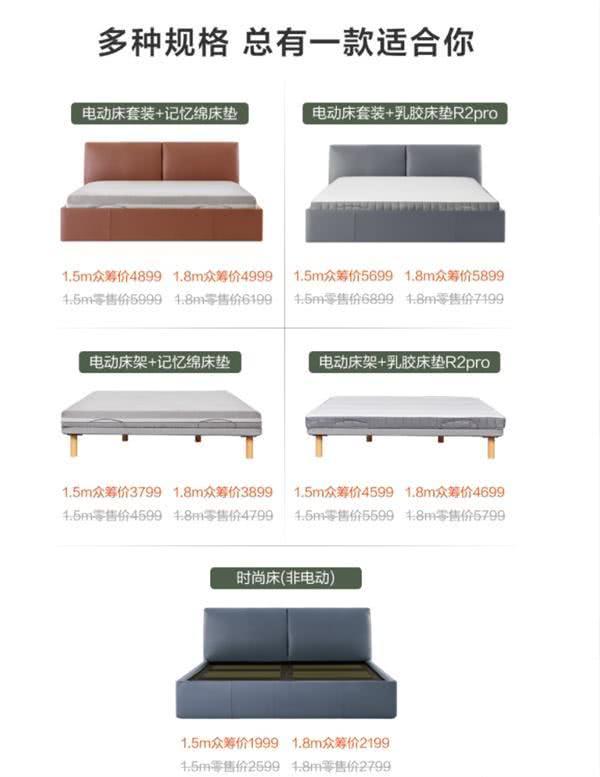 上架的共有10个型号,分别为1.5米的1.5米和1.8米的5种型号,分别是1个非电动版本,2个智能电动床架,2个智能电动床集。如果单独购买电动床架和床垫,则可以将家里的床升级为智能电动床,或直接将其用作电动榻榻米。