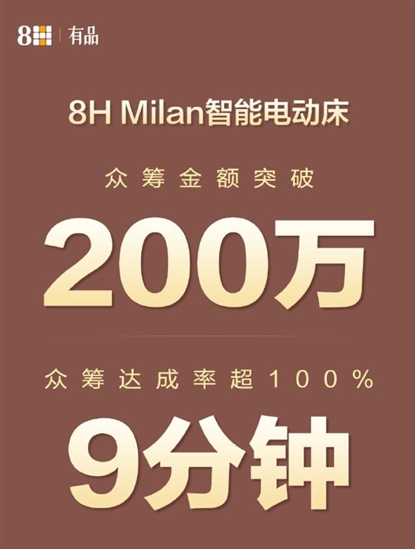12月3日,米兰8H智能电动床在小米有品正式启动众筹,价格从1999元起,未来零售价从2599元起。来自生产商Fangqusue的技术新闻,8H Milan智能电动床仅在9分钟内就实现了超过100%的众筹率。到19:00为止,众筹金额已超过225万元,达到了众筹目标的450%。