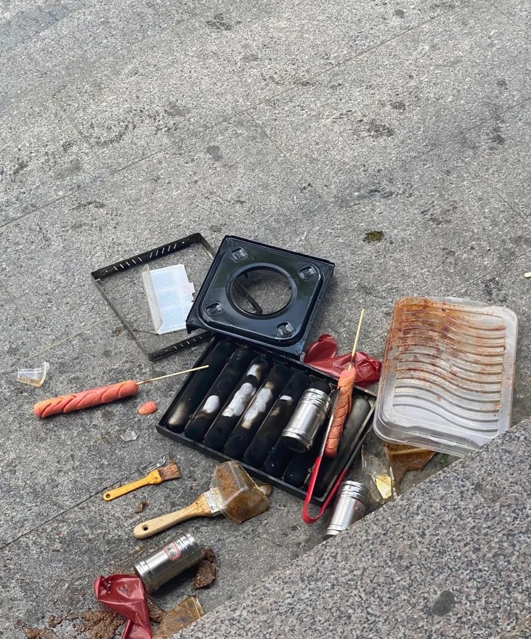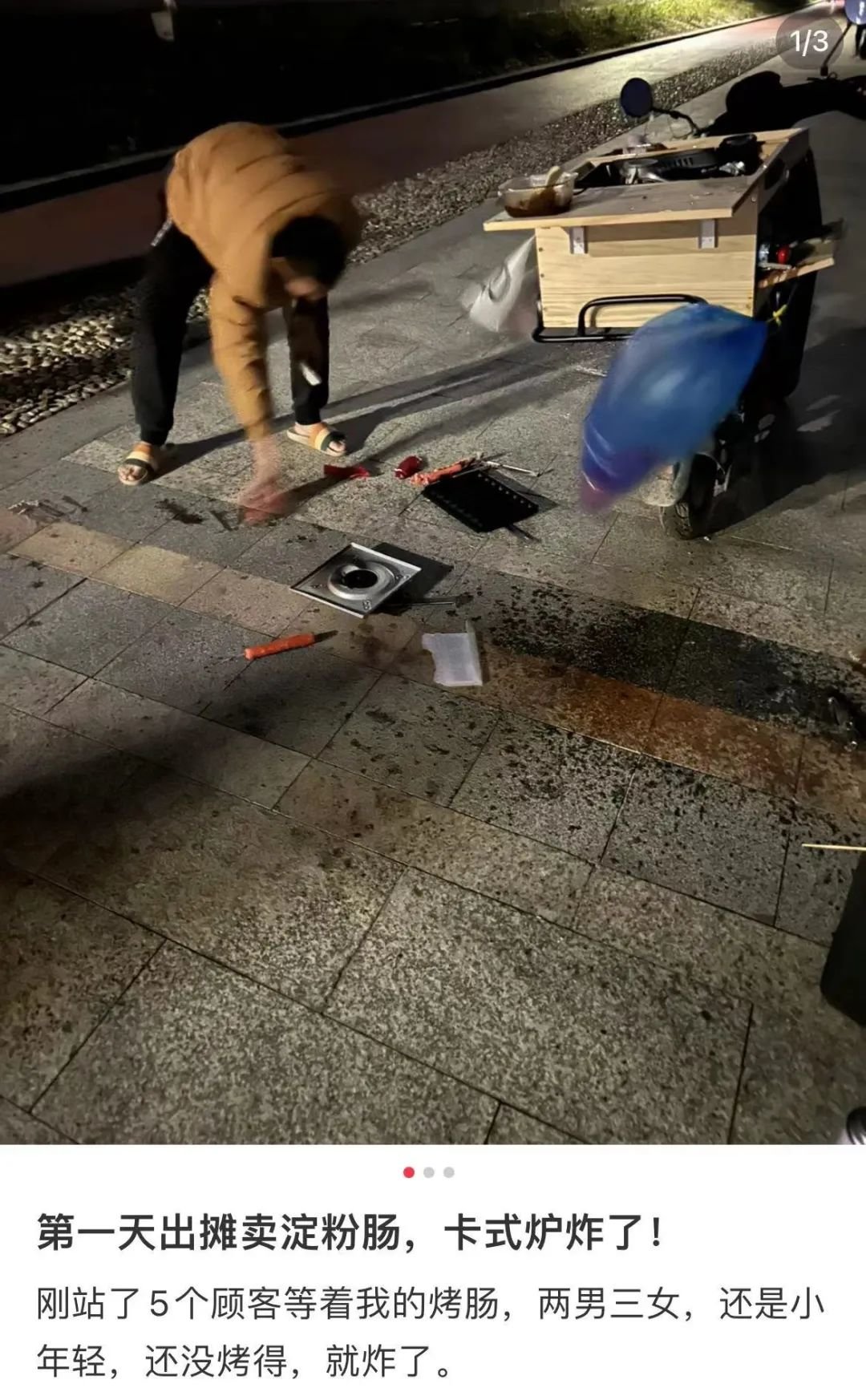 那些在电动车、自行车、小推车后座上贩卖淀粉肠的朋友,面对被炸翻的摊位,还不忘用细腻的笔法描绘了等待烤肠的5位顾客:“两男三女,还是小年轻。”