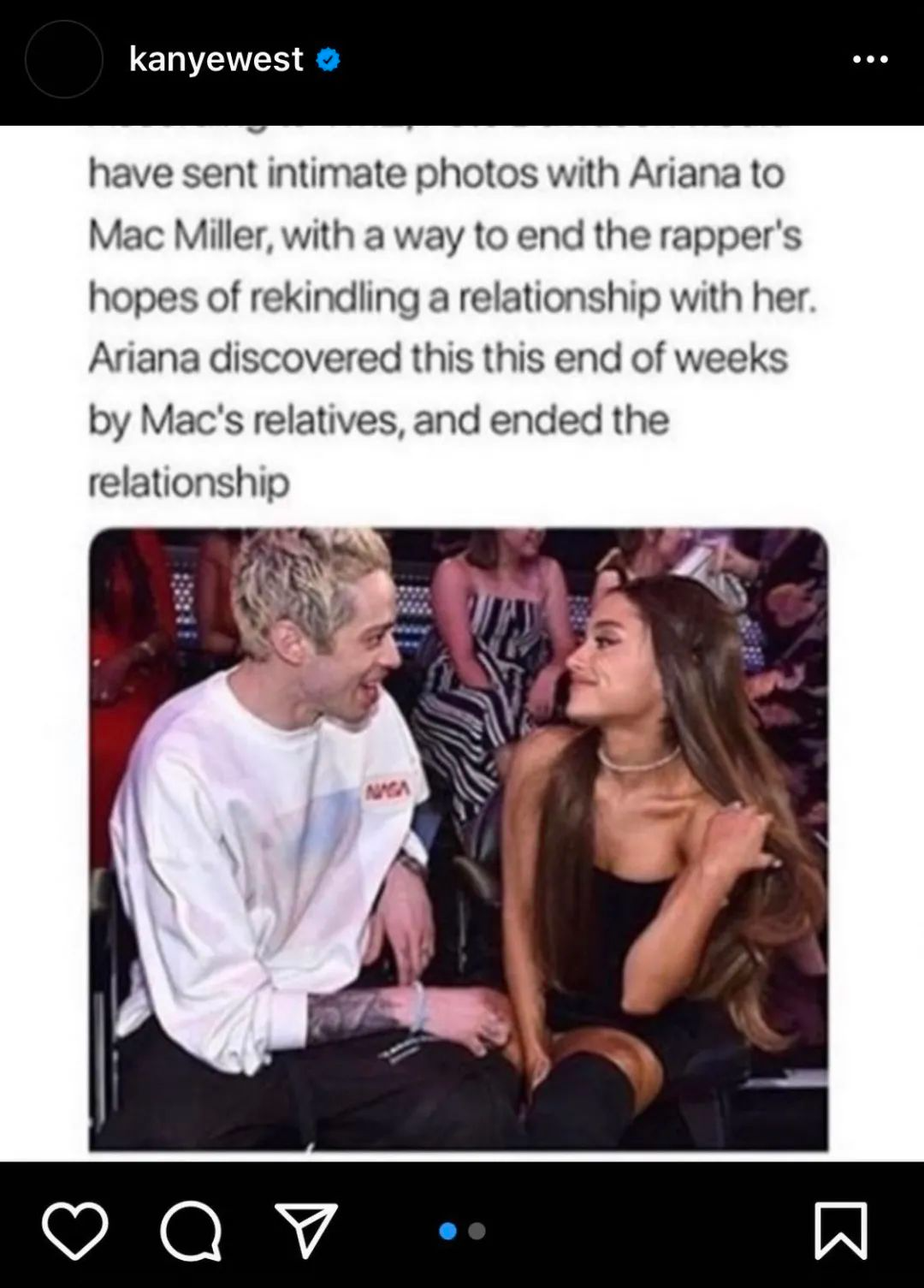 他通过 Instagram 分享了一则旧闻,内容是Pete Davidson 对 Ariana 的精神PUA行为,和如何被A妹甩掉的故事。