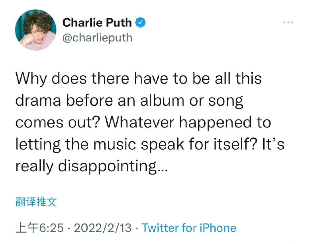 包括知名男歌手 Charlie Puth(查理·普斯)在内的很多人认为,在发歌之前,把别的明星牵扯到 Drama 之中,进行消费和炒作是一种不太道德的行为,令人失望而且并不光明磊落。