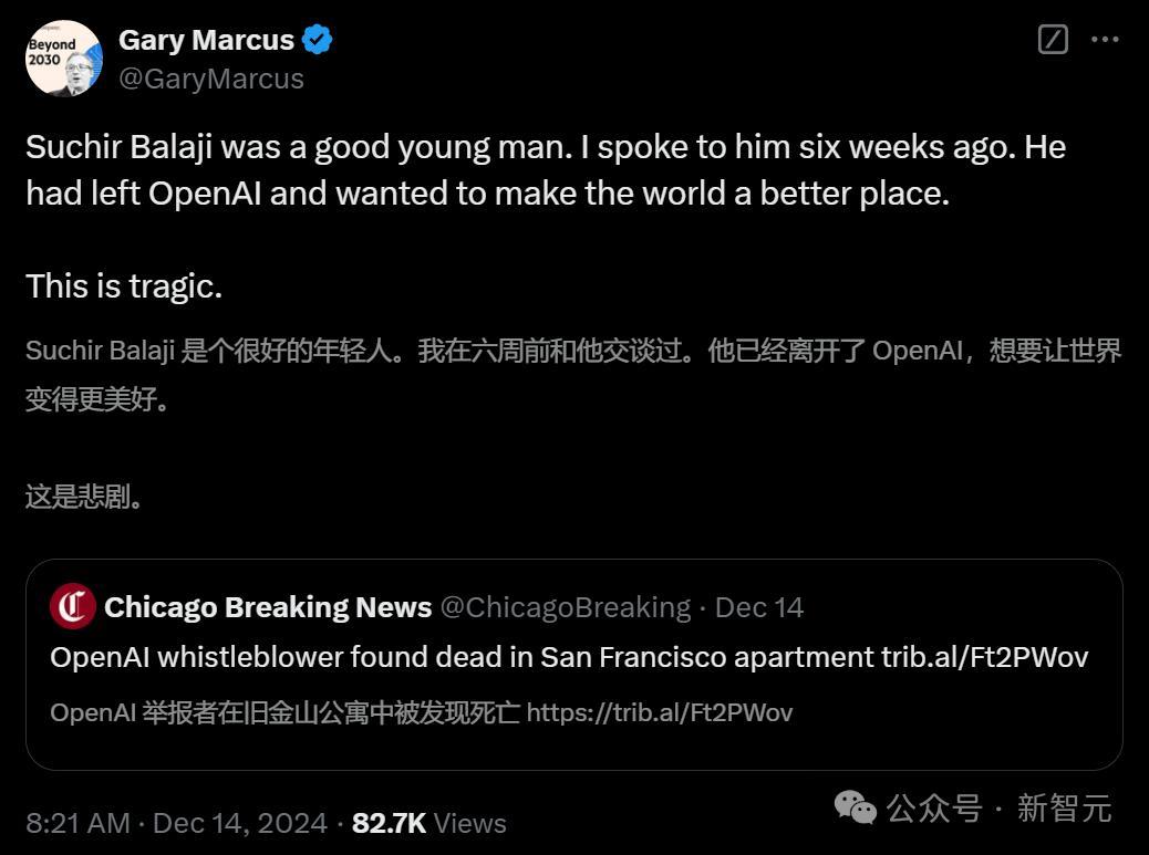 几天前,消息曝出,曾在OpenAI工作四年,指控公司侵犯版权的Suchir Balaji,上月底在旧金山公寓中被发现死亡,年仅26岁。